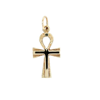 Pre- owned. A 9ct yellow gold ankh cross pendant. Solid gold throughout with plain polished and engraved bark effect detail to the front and engrav...