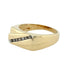 Pre- owned. A 9ct yellow gold rectangular signet ring. Plain polished yellow gold setting in portrait orientation, raised centre set diagonally with seven small round brilliant cut diamonds (combined weight 0.15ct). Tapered shoulders extend to a 3mm wide band.